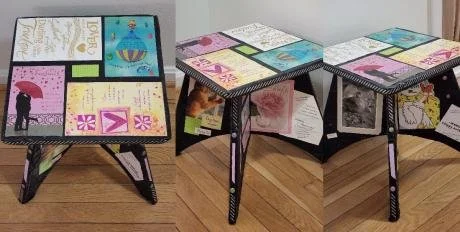 Just when I thought I had no creativity left in me, I allowed myself to take a chance and attended the first Craft Workshop facilitated by the HWC Bereavement team. I was pleasantly surprised when I made a beautiful picture frame covered in Robert’s shirt. I was inspired by the first project, so then I turned a stool that was about to go in the garbage into art with a pair of Robert’s pants and many of the greeting cards that we had exchanged over the years. Working with my husband’s clothes has helped me reconcile his death and has brought me closer to peace and healing. Looking at this art helps me feel like he is still there in some way.